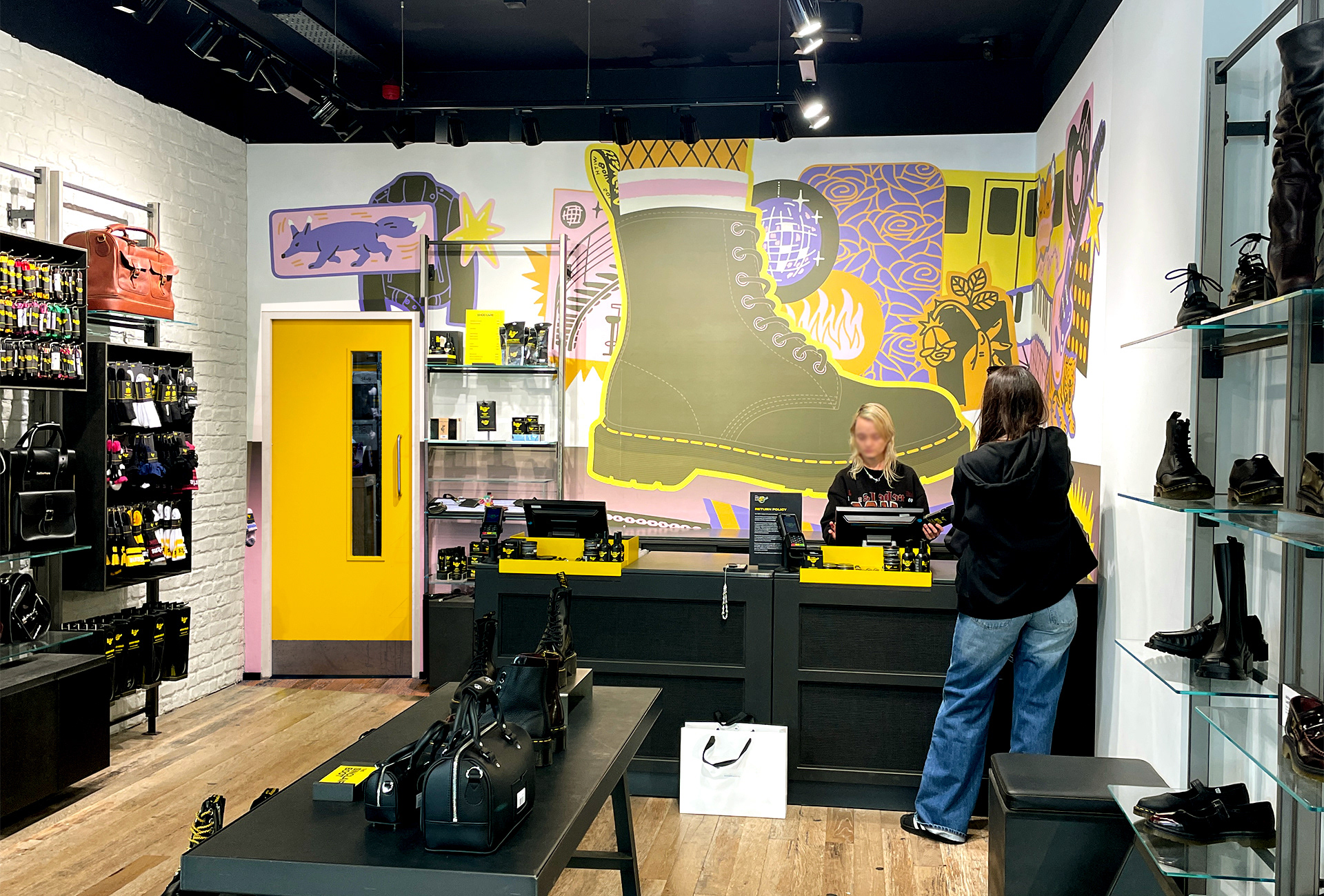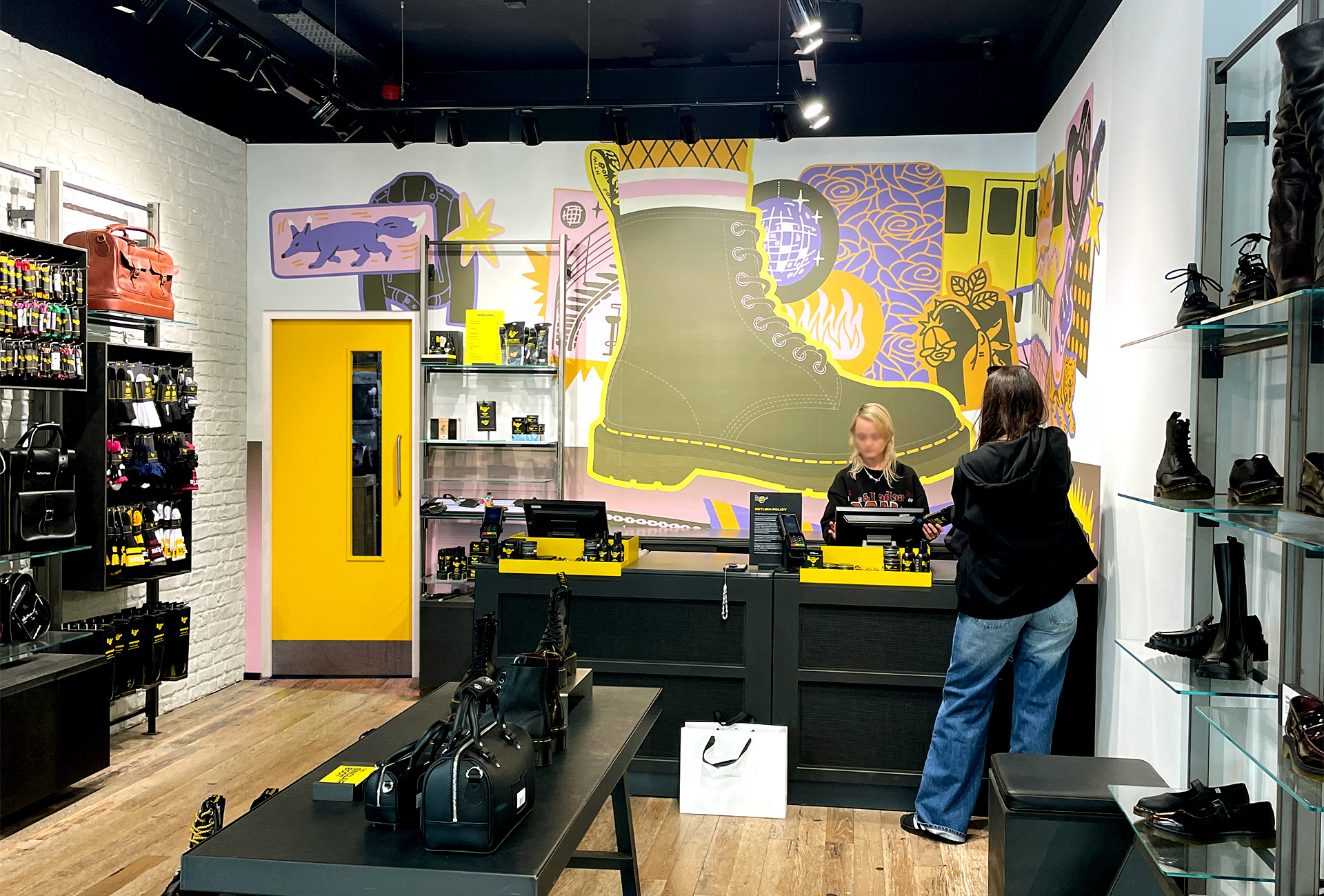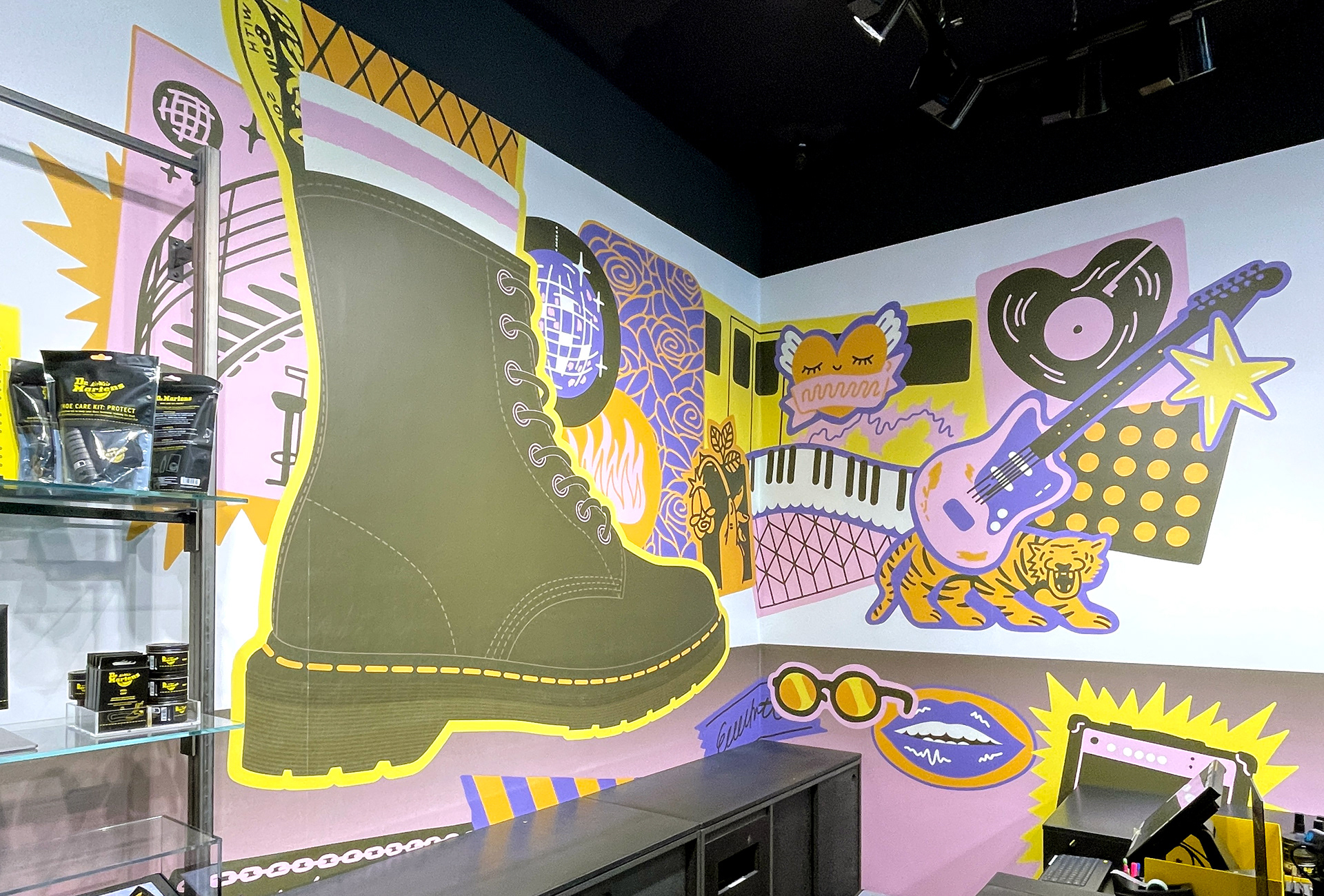Pulling the focus on to the iconic 1460 boot surrounded by the things that make Berlin Berlin, the mural is placed around the cash register, visible from the outside.