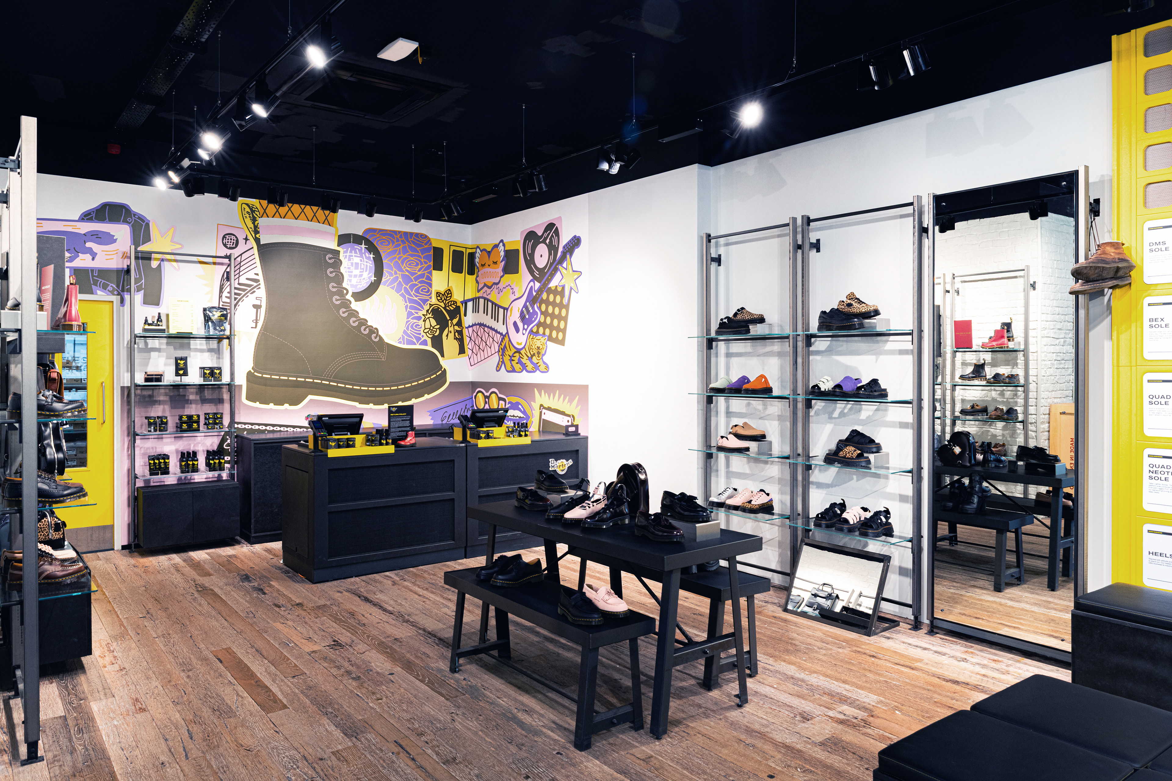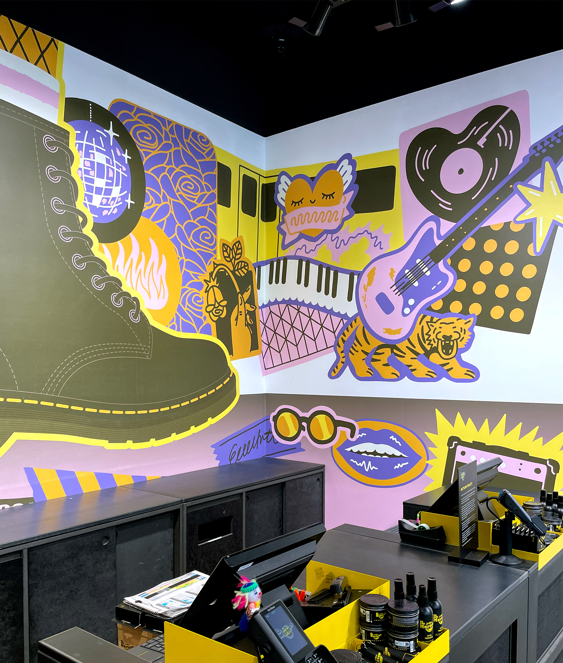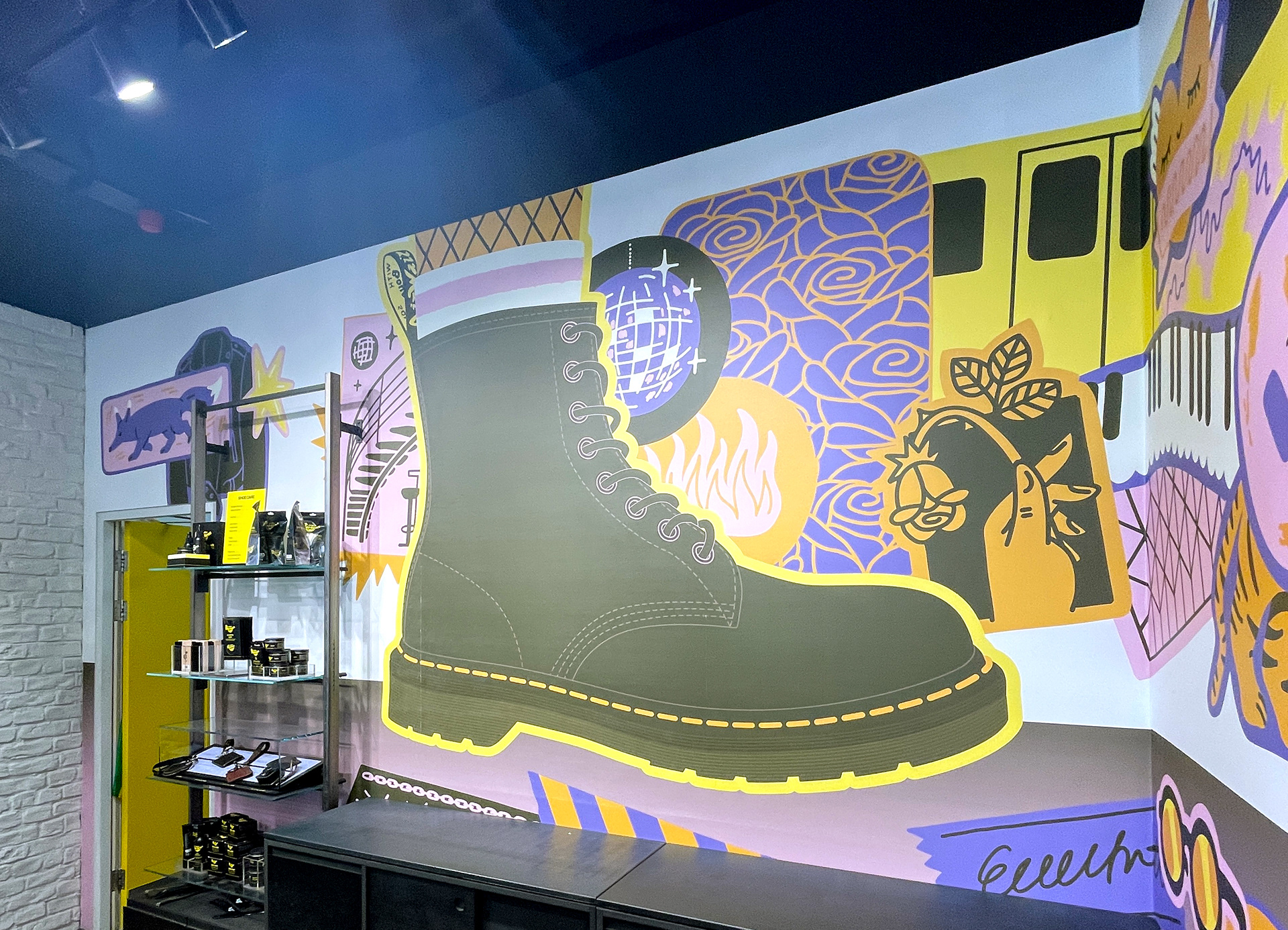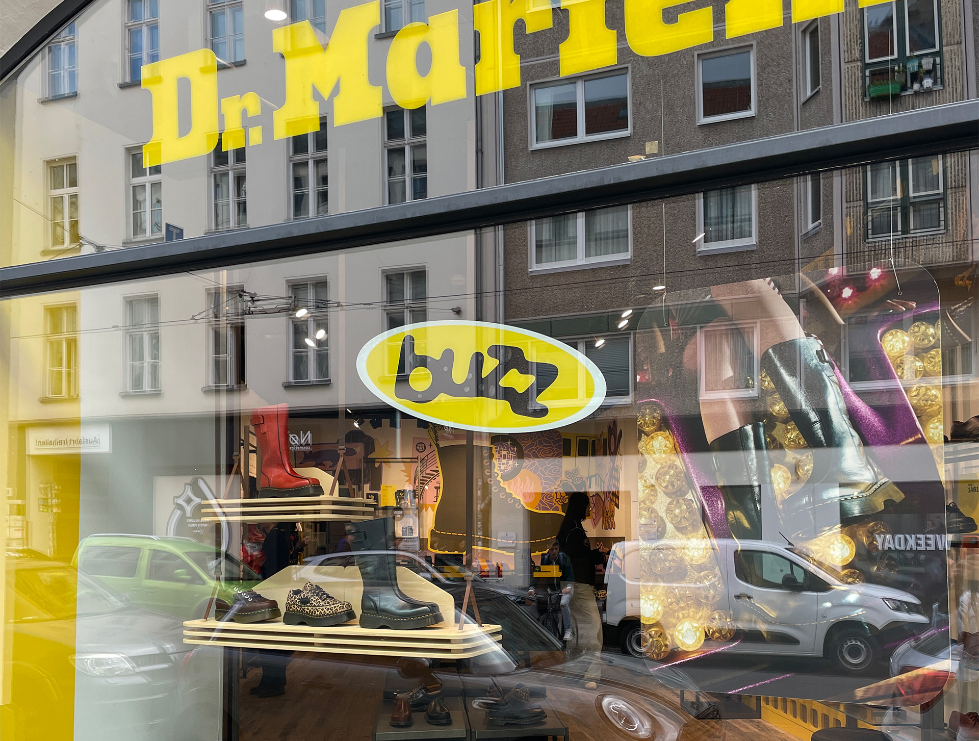 Pulling the focus on to the iconic 1460 boot surrounded by the things that make Berlin Berlin, the mural is placed around the cash register, visible from the outside.