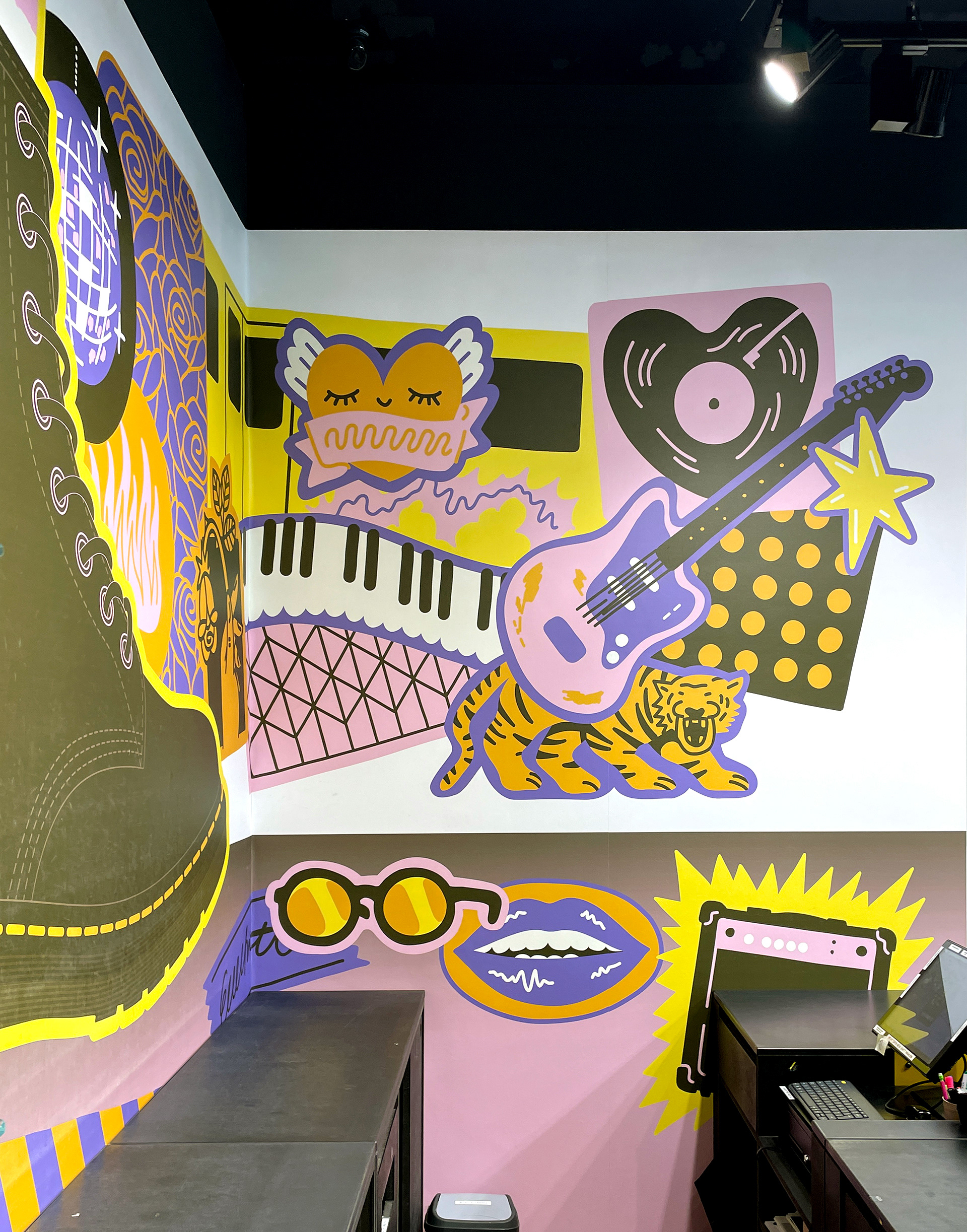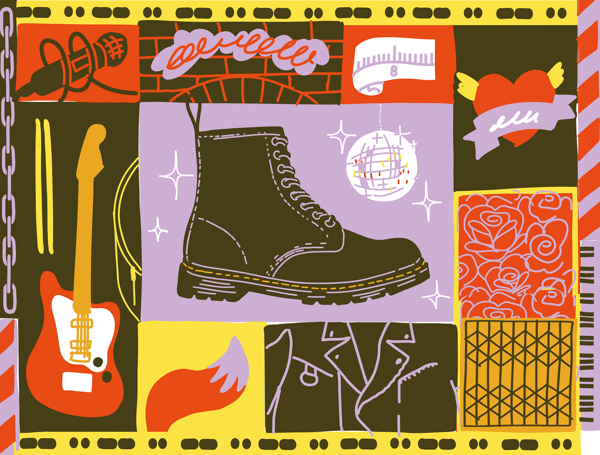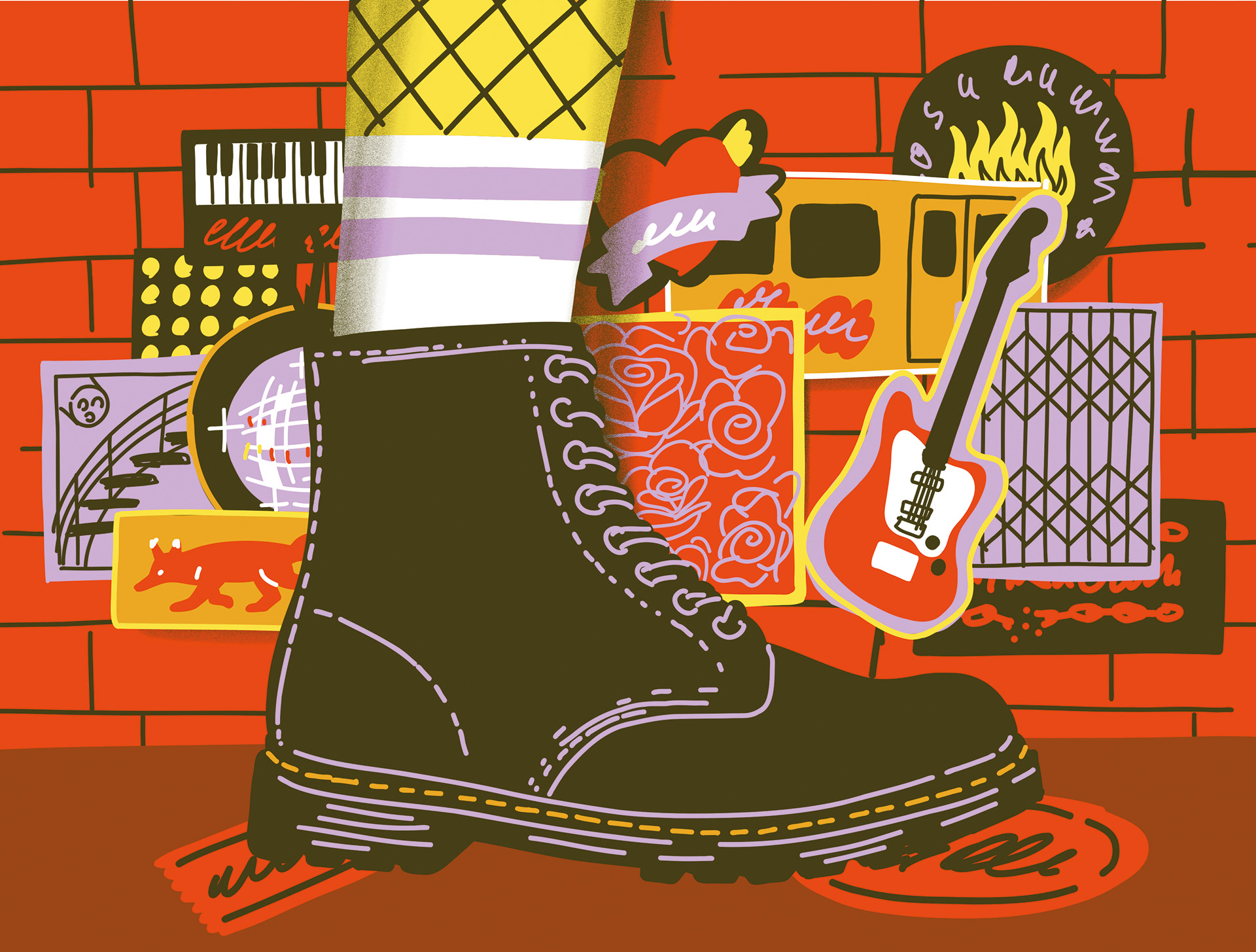 I had the pleasure of designing a mural for the Dr. Martens store in Berlin, Mitte, featuring the iconic 1460 boot and many subcultural influences in Berlin's punk and rock past and present. Since music is a big part of Dr. Martens brand identity, I dug deep into Berlin's musical past.