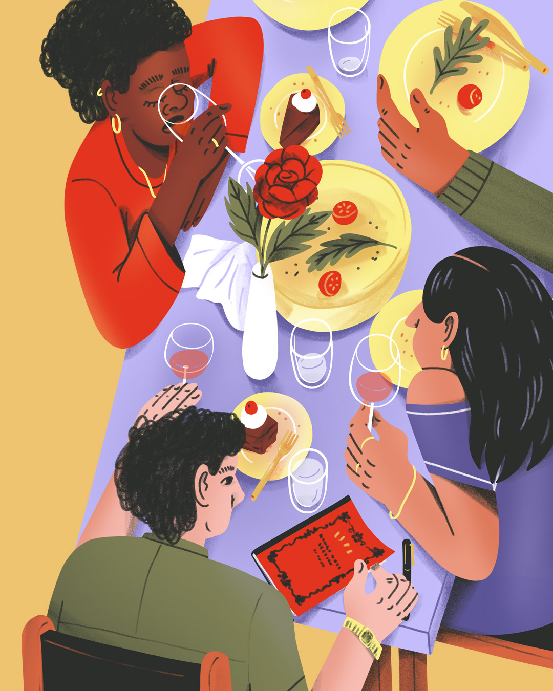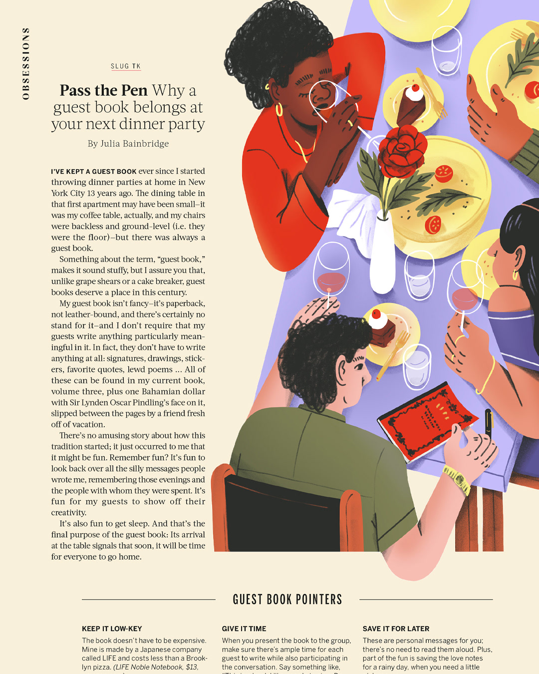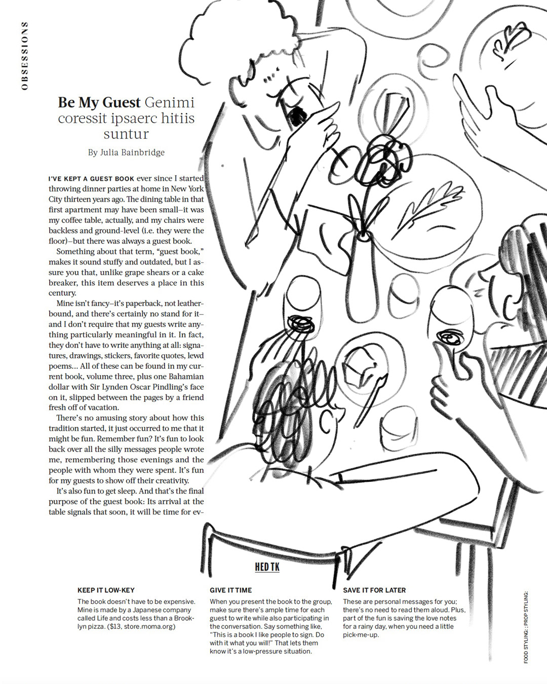 Illustration about having a guest book for dinner parties. AD Ann Martin Foley